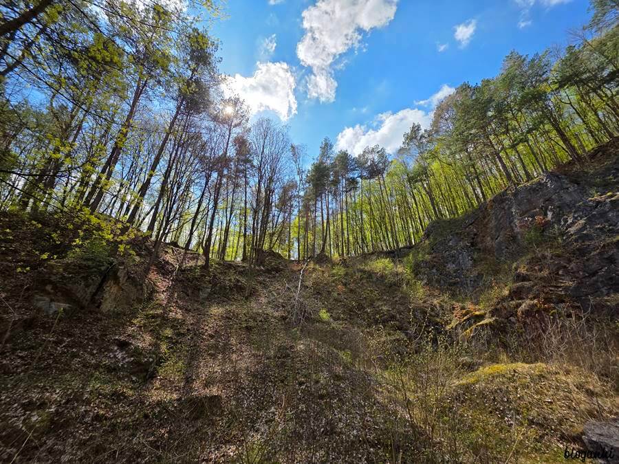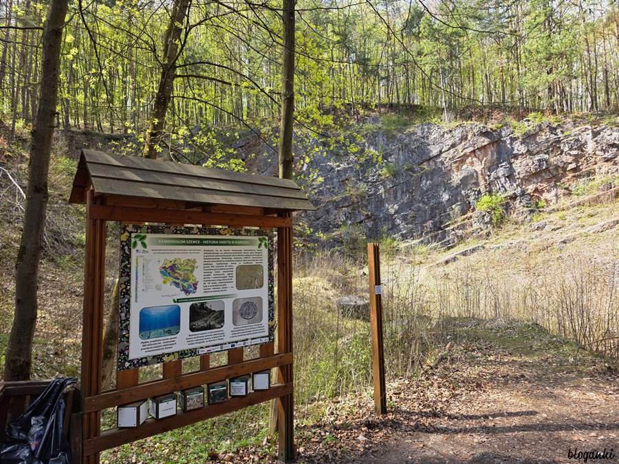 Przed Wami dłuży odcinek asfaltowy (ok 1,5 km) z pięknym widokiem na zamek w Chęcinach. Nad trasą S7 czeka Was kładka a później jeden z najciekawszych fragmentów trasy – przejście granią Góry Zelejowej, na której eksploatowano najcenniejszy „marmur kielecki” zwany różanką.