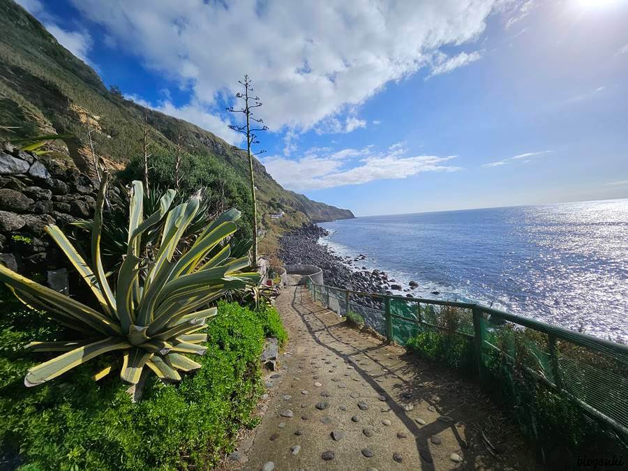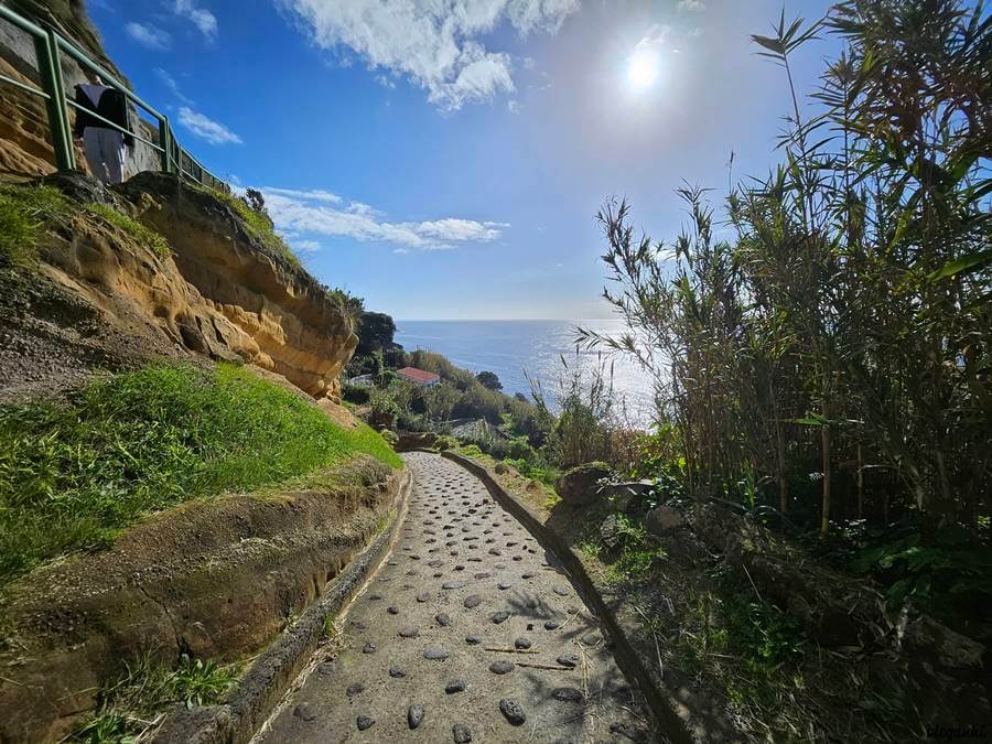 Po dotarciu do drzewa (araukarii wyniosłej), widać ostatnie domy Rocha da Fajã, położone na najdalej na zachód wysuniętym krańcu fajã. Biorąc pod uwagę, że skrót kończy się obok tych domów, będziecie musieli wrócić tą samą ścieżką na parking. Udanej wspinaczki!